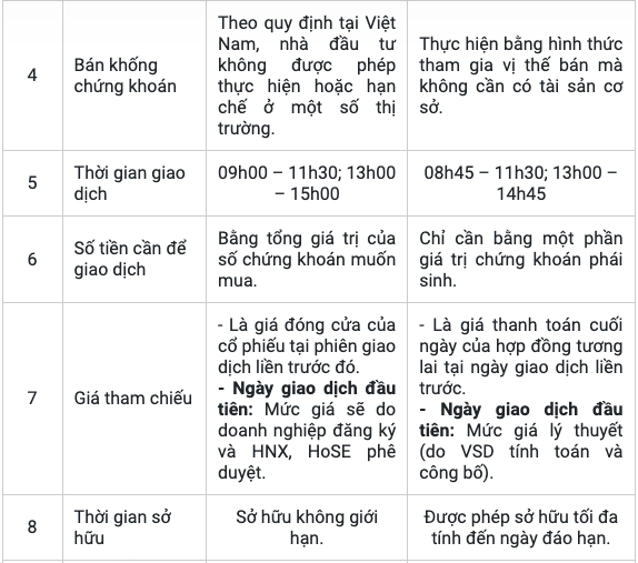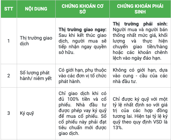 Giữa chứng khoán cơ sở và chứng khoán phái sinh sẽ có những điểm khác biệt cụ thể và được thể hiện thông qua: Thị trường giao dịch, những loại lệnh giao dịch, số lượng phát hành, số lượng niêm yết và bán khống chứng khoán, hay như số tiền cần phải có để có thể giao dịch, các loại lệnh giao dịch và chu kỳ thanh toán… cụ thể được trình bày trong bảng sau:
