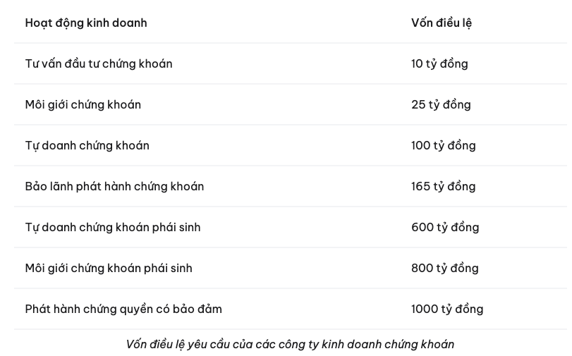 Lưu ý công ty chứng khoán chỉ có thể thực hiện hoạt động bảo lãnh phát hành chứng khoán khi thực hiện nghiệp vụ tự doanh chứng khoán. Tuy nhiên, để được cấp phép kinh doanh, công ty cần phải đảm bảo những quy định trên. Thêm vào đó, vốn điều lệ yêu cầu của các hoạt động này cụ thể như sau: