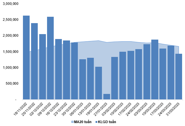 Khối lượng và giá trị giao dịch của thị trường phái sinh lần lượt tăng 25,63% và 26,22% so với phiên ngày 30/03/2023. Tính chung cả tuần, khối lượng và giá trị giao dịch tuần lần lượt giảm 12,81% và 14,74% so với tuần trước.