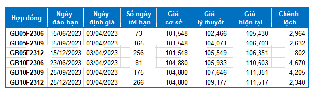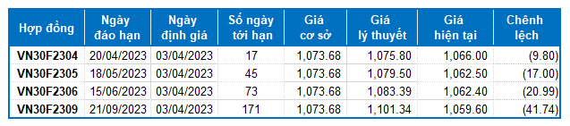 Dựa trên phương pháp định giá hợp lý với thời điểm khởi đầu ngày 03/04/2023, khung giá hợp lý của các hợp đồng tương lai đang được giao dịch trên thị trường được thể hiện như sau: