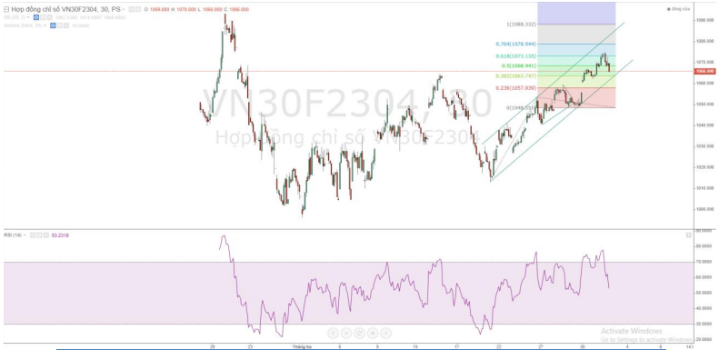 VN30F2304 điều chỉnh từ ngưỡng 1.075 điểm nhưng giao dịch trong đường kênh giá tăng ngắn hạn cho thấy xu hướng tăng vẫn duy trì. Đồng thời, RSI đang về lại gần ngưỡng 50 cho thấy nhịp hồi phục sẽ tiếp diễn lên vùng 1.078-1.081 điểm. Vùng 1.057-1.060 điểm là vùng hỗ trợ cho nhịp điều chỉnh.