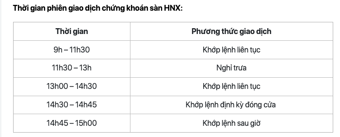Thời gian phiên giao dịch chứng khoán sàn HNX: