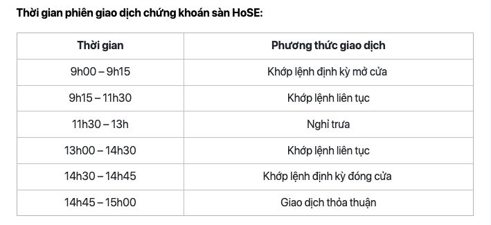 - Thời gian phiên giao dịch chứng khoán sàn HoSE: