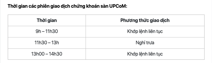 - Thời gian các phiên giao dịch chứng khoán sàn UPCoM: