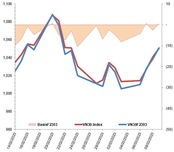 Các hợp đồng tương lai đồng loạt tăng điểm trong phiên giao dịch ngày 09/03/2023. Cụ thể, VN30F2303 (F2303) tăng 1,22%, đạt 1.050,7 điểm; VN30F2304 (F2304) tăng 1,42%, đạt 1,048 điểm; hợp đồng VN30F2306 (F2306) tăng 1,45%, đạt 1.043,9 điểm; hợp đồng VN30F2309 (F2309) tăng 1,65%, đạt 1.044,7 điểm. Chỉ số cơ sở VN30-Index kết phiên ở mức 1.050,28 điểm.