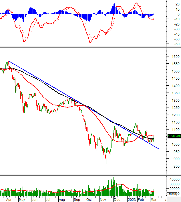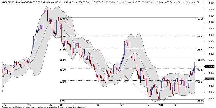 Trong phiên giao dịch ngày 09/03/2023, VN30-Index tiếp tục tăng điểm nhưng lại gặp áp lực bán tại đường SMA 50 ngày cho thấy lực cầu vẫn chưa thật sự quá mạnh.