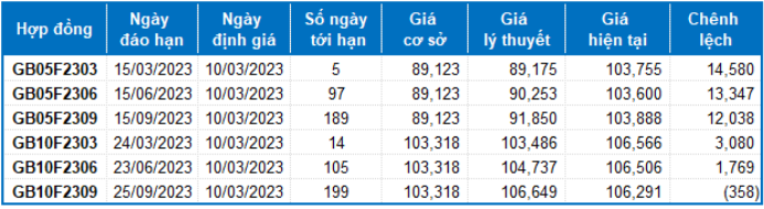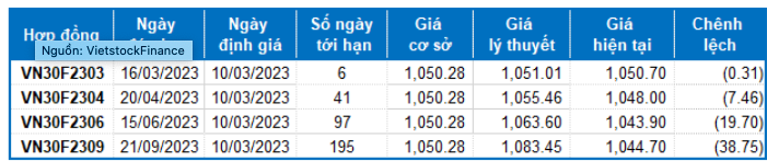 Dựa trên phương pháp định giá hợp lý với thời điểm khởi đầu ngày 10/03/2023, khung giá hợp lý của các hợp đồng tương lai đang được giao dịch trên thị trường được thể hiện như sau: