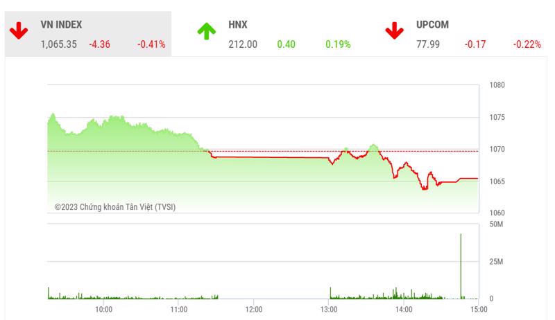 Lực bán tăng nhanh, VN-Index kết phiên "đỏ nhẹ": Đóng cửa phiên giao dịch ngày 10/4, sàn HOSE có 173 mã tăng và 215 mã giảm, VN-Index giảm 4,36 điểm (-0,41%), xuống 1.065,35 điểm. Tổng khối lượng giao dịch đạt 857,46 triệu đơn vị, giá trị hơn 15.056 tỷ đồng, tăng 32,73% về khối lượng và 39,64% về giá trị so với phiên cuối tuần trước ngày 7/4. Giao dịch thỏa thuận đóng góp 68,25 triệu đơn vị, giá trị 1.975,78 tỷ đồng.