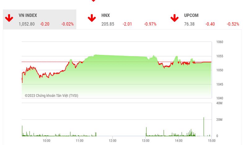 Phiên giao dịch ngày 13/3, VN-Index đóng cửa ở mốc 1.052,80 điểm, giảm nhẹ 0,20 điểm (-0,02%). HNX-Index giảm 2,01 điểm (-0,97%) xuống 205,85 điểm, UPCoM-Index giảm 0,4 điểm (-0,52%) còn 76,38 điểm. Thanh khoản có sự cải thiện so với phiên trước đó khi có hơn 600 triệu cổ phiếu được giao dịch, tổng khối lượng khớp lệnh trên toàn sàn đạt mức hơn 11 nghìn tỷ đồng. Mặc dù đóng cửa ở gần mốc tham chiếu nhưng sắc đỏ lại chiếm ưu thế vượt trội hơn trong phiên hôm nay với 288 mã giảm điểm, gấp hơn hai lần số mã tăng điểm với con số chỉ là 114, còn lại là 61 mã đóng cửa ở mốc tham chiếu.