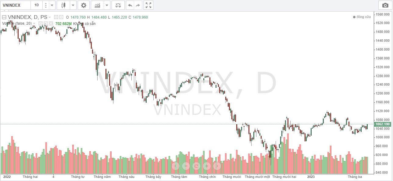 Phiên giao dich ngày 15/3, VN-Index đóng cửa ở mốc 1062,19, tăng mạnh 22,06 điểm (+2,12%) so với phiên trước đó. Thanh khoản tiếp tục được duy trì ở mức ổn định khi có hơn 600 triệu cổ phiếu được giao dịch, tổng khối lượng khớp lệnh trên toàn sàn đạt mức hơn 10 nghìn tỷ đồng. Sắc xanh gần như bao chùm toàn bảng điện trong phiên hôm nay với 380 mã tăng điểm, trong khi đó số mã giảm điểm chỉ là 43 và cũng có 43 mã cổ phiếu đóng cửa ở mốc tham chiếu.