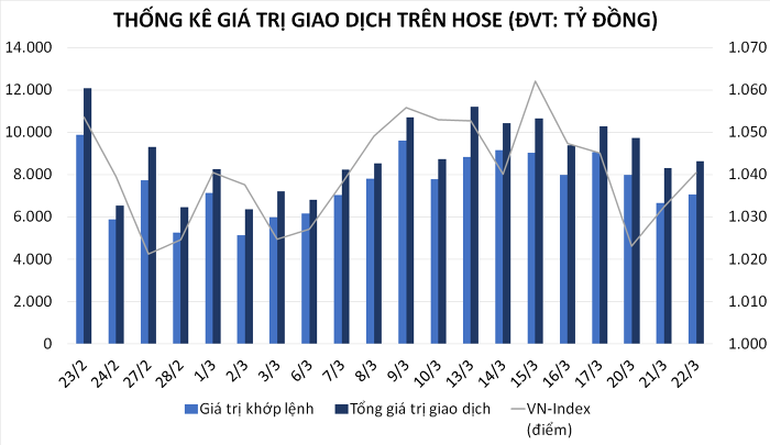 Vững nhịp hồi phục, VN-Index vượt mốc 1.040 điểm: Phiên giao dịch ngày 22/3, VN-Index tăng 8,11 điểm (+0,79%), lên 1.040,54 điểm với 203 mã tăng và 170 mã giảm. Tổng khối lượng giao dịch đạt 458,8 triệu đơn vị, giá trị 8.647,7 tỷ đồng, giảm nhẹ về khối lượng, nhưng tăng nhẹ về giá trị so với phiên hôm qua. Trong đó, giao dịch thỏa thuận đóng góp 76 triệu đơn vị, giá trị 1.584 tỷ đồng.
