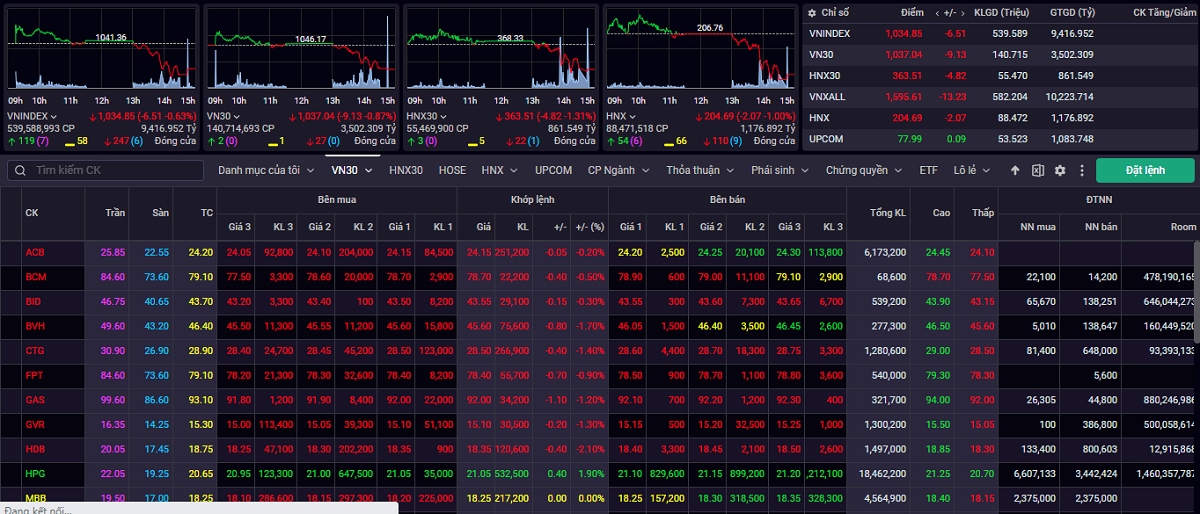 Nhóm chứng khoán bị bán, VN-Index giảm phiên thứ 3 liên tiếp: Đóng cửa phiên giao dịch ngày 25/4, sàn HOSE có 119 mã tăng và 247 mã giảm, VN-Index giảm 6,51 điểm (-0,63%), xuống 1.034,85 điểm. Tổng khối lượng giao dịch đạt gần 539,6 triệu đơn vị, giá trị 9.417 tỷ đồng, giảm nhẹ 3% về khối lượng nhưng tăng 3% về giá trị so với phiên hôm qua. Giao dịch thỏa thuận đóng góp hơn 53,8 triệu đơn vị, giá trị 1.031,5 tỷ đồng.
