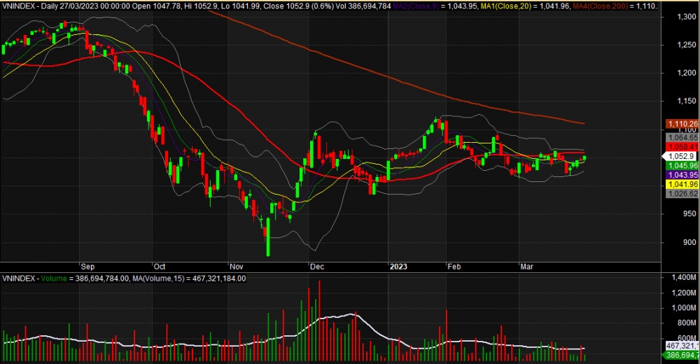 Đầu tuần thuận lợi, VN-Index lấy lại mốc 1.050: Đóng cửa phiên giao dịch ngày 27/3, sàn HOSE có 245 mã tăng và 138 mã giảm, VN-Index tăng 5,46 điểm (+0,52%), lên 1.052,25 điểm. Tổng khối lượng giao dịch đạt 556,95 triệu đơn vị, giá trị 9.715,66 tỷ đồng, giảm 3,93% về khối lượng nhưng tăng 2,89% về giá trị so với phiên cuối tuần trước ngày 24/3. Giao dịch thỏa thuận đóng góp 46,48 triệu đơn vị, giá trị 1.285,32 tỷ đồng.