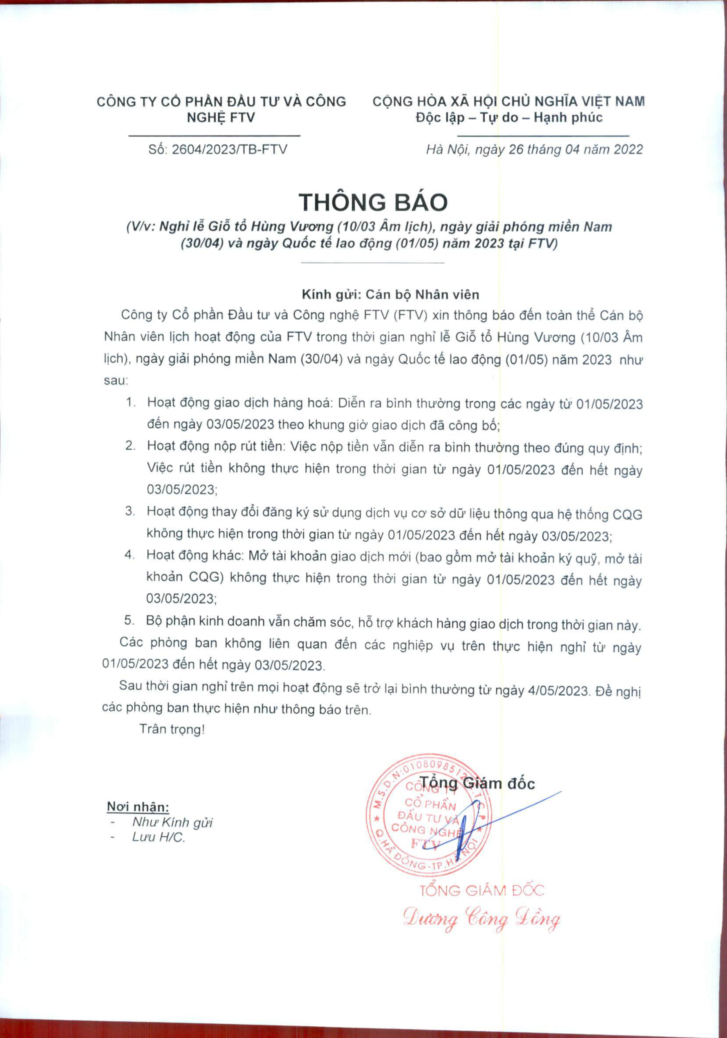 Công ty Cổ phần Đầu tư và Công nghệ FTV Thông Báo về Lịch Nghỉ Lễ Giỗ Tổ Hùng Vương (10/03 Âm lịch), Ngày Giải Phóng Miền Nam (30/04) và Ngày Quốc Tế Lao Động (01/05) năm 2023 như sau: