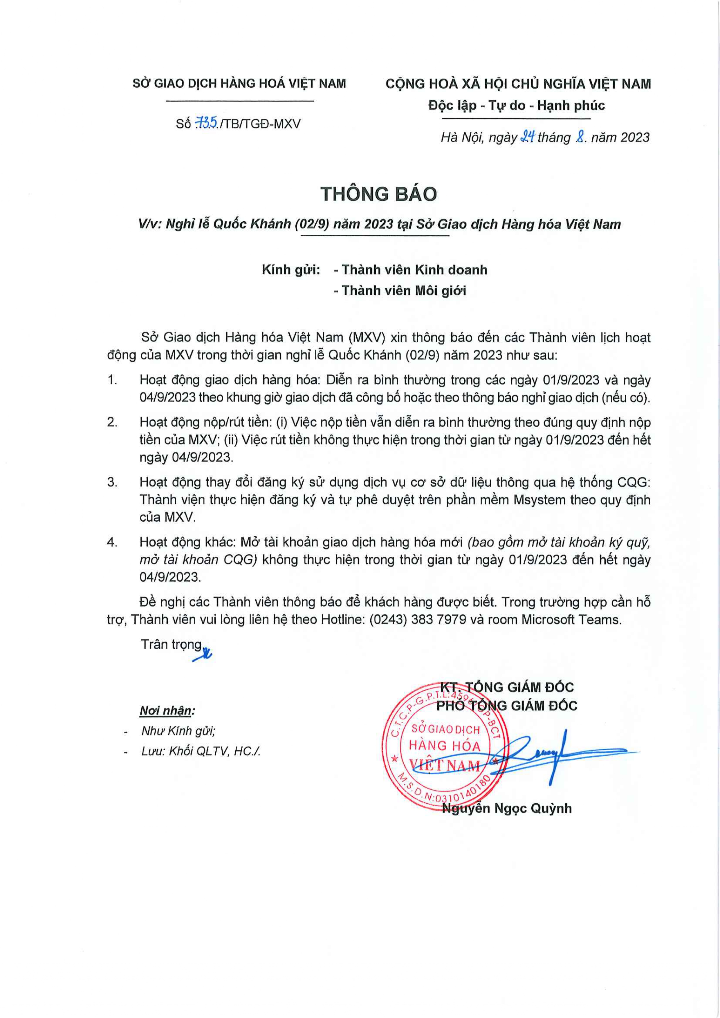Xem chi tiết tại file đính kèm: 735TB vv Nghỉ lễ Quốc Khánh (02/09) năm 2023 tại Sở Giao dịch Hàng hóa Việt Nam