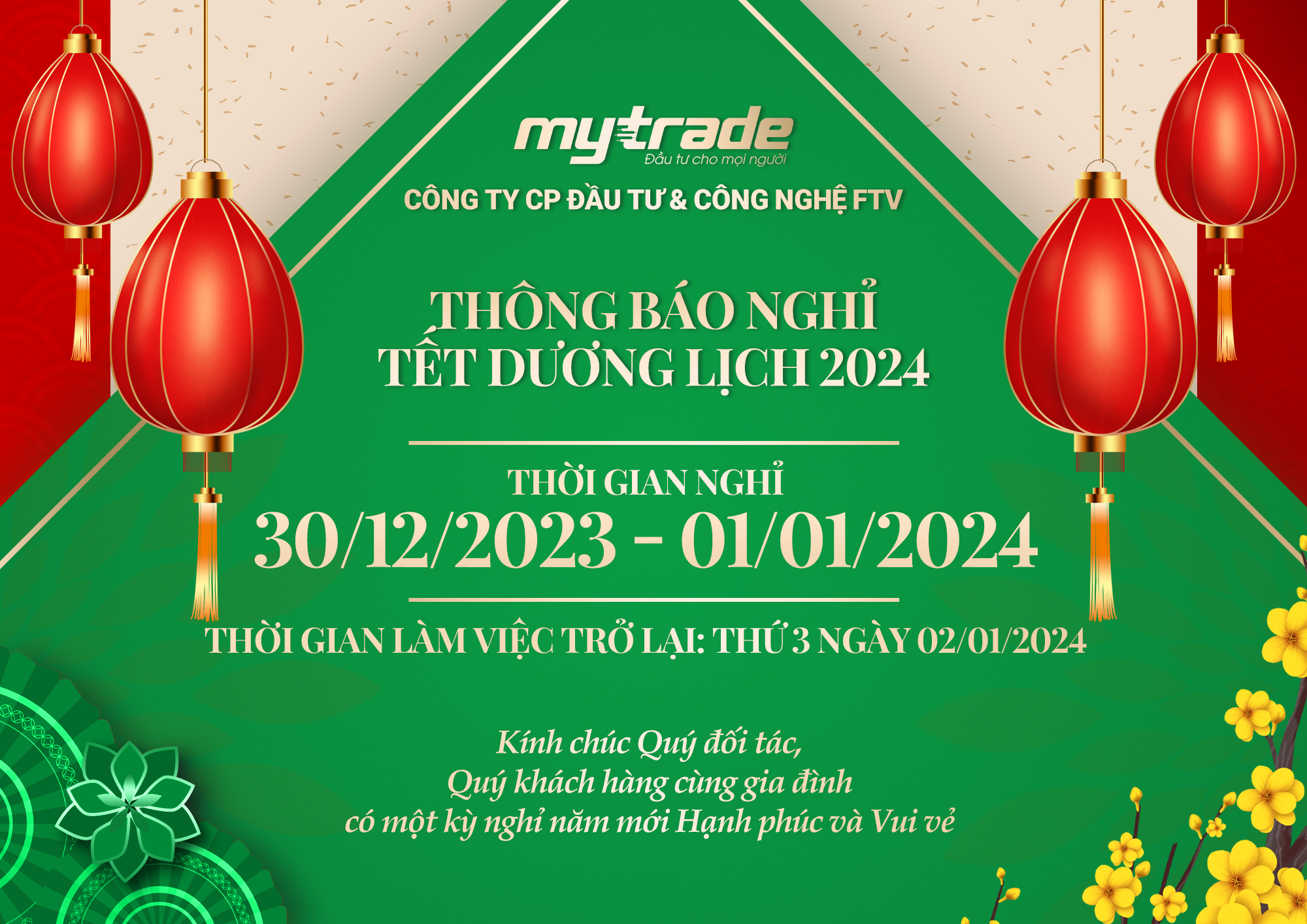 Công ty Cổ phần Đầu tư và Công nghệ FTV xin trân trọng thông báo tới Quý đối tác và Quý khách hàng về lịch nghỉ lễ Tết Dương Lịch 2024 như sau: