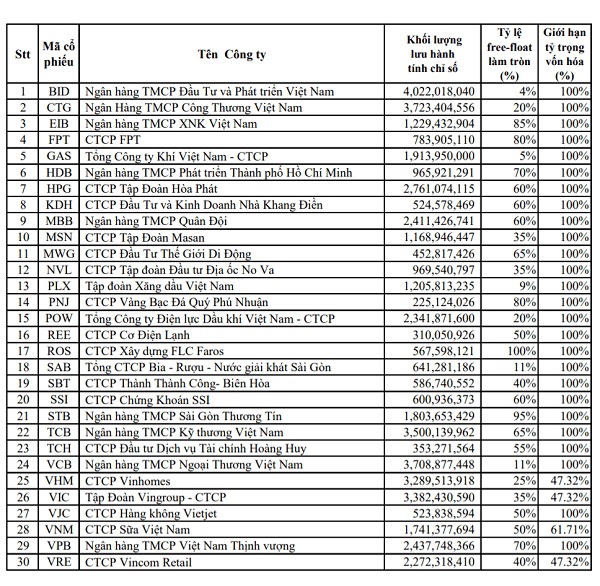 Sàn HoSE rà sát và xét duyệt chỉ số VN30 liên tục, cùng với đó là những sự thay đổi của những mã cổ phiếu trong rổ. Sau đây là danh sách VN30 mới nhất được cập nhật bao gồm những mã cổ phiếu sau: